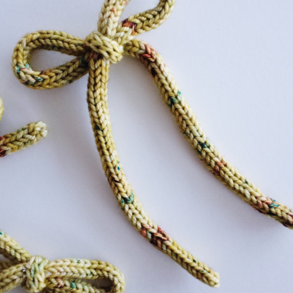 •Hand-Dyed Merino Wool, french knitted into a petite schoolgirl bow.