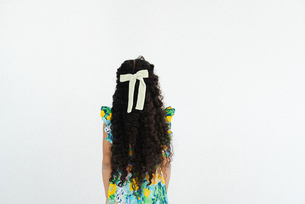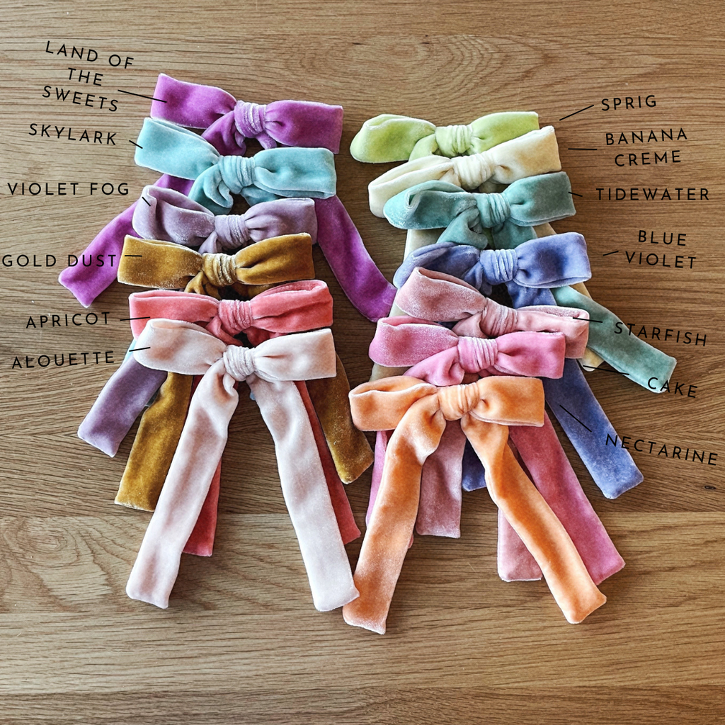Ribbon-style velvet bows with long tails. This velvet style does NOT have wire inside the loops, for a more floppy and romantic look.