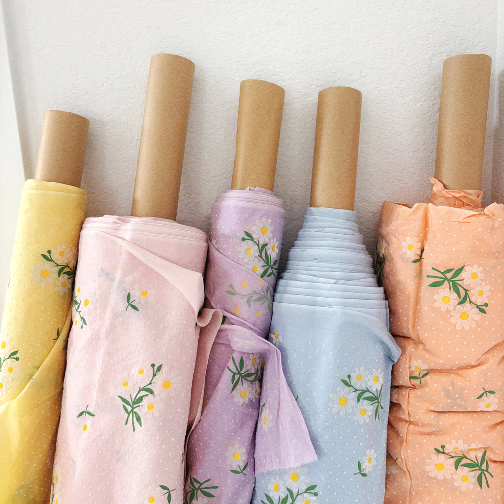 This lovely vintage replica has single and clustered daisies with flocked white petals and tiny white flocked pin dots all over. The daisies have pigment printed yellow centers and green stems and are printed on a peach cotton lawn base fabric. We can't wait to see what you create! Make sure to tag us on instagram to show us the finished product.
