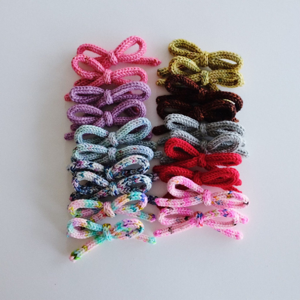•Hand-Dyed Merino Wool, french knitted into a petite schoolgirl bow.