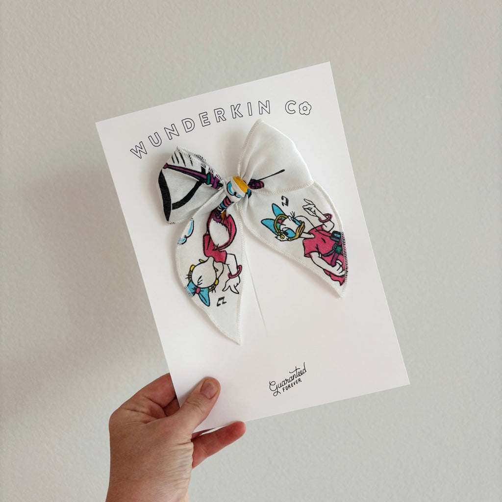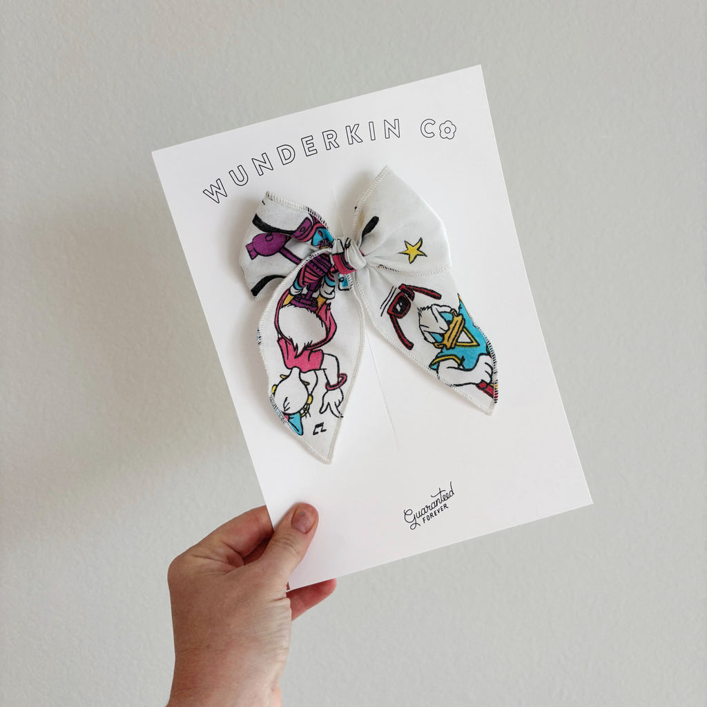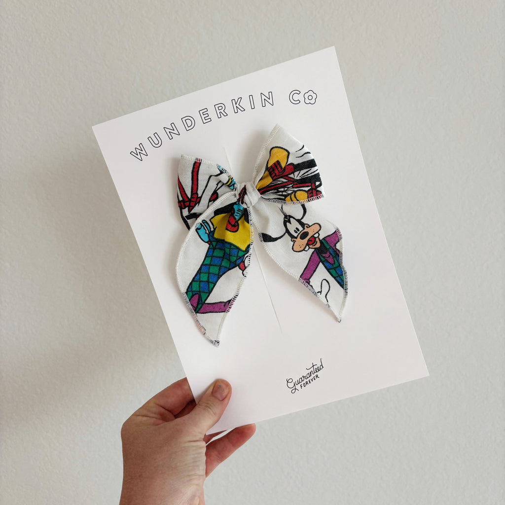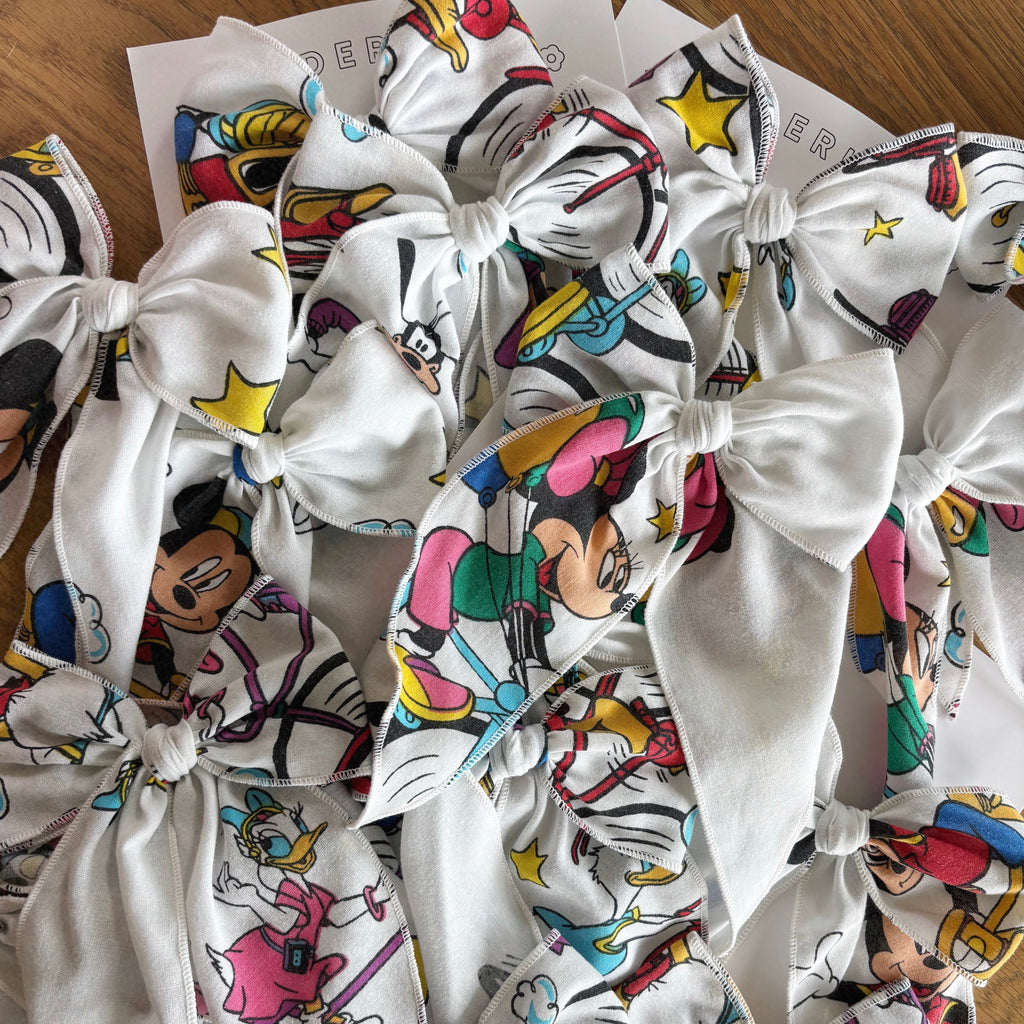 •One-of-a-kind bow made from 90s upcycled sheets. Please note each will be unique and have different character placement, but every bow will have one full character face! If you have a special character request, please leave in the notes at checkout! Or if you do NOT want a specific character, let us know too. Characters are Mickey, Minnie, Goofy, Daisy Duck and Donald Duck.