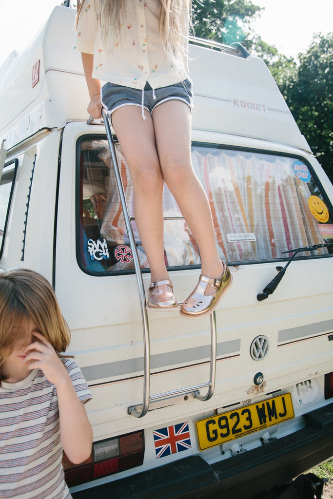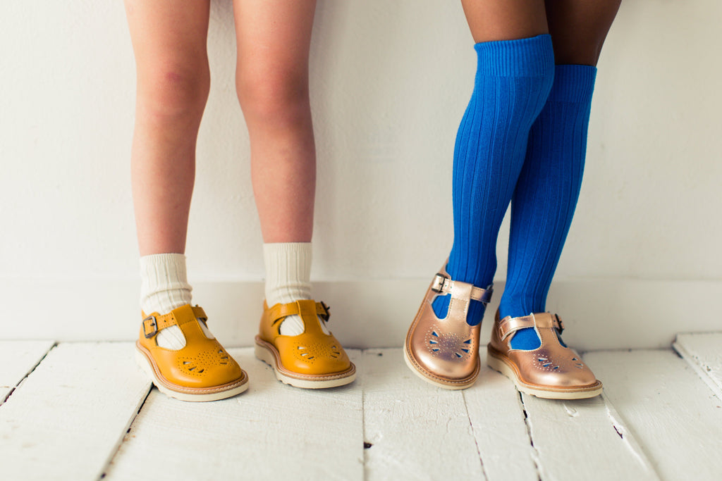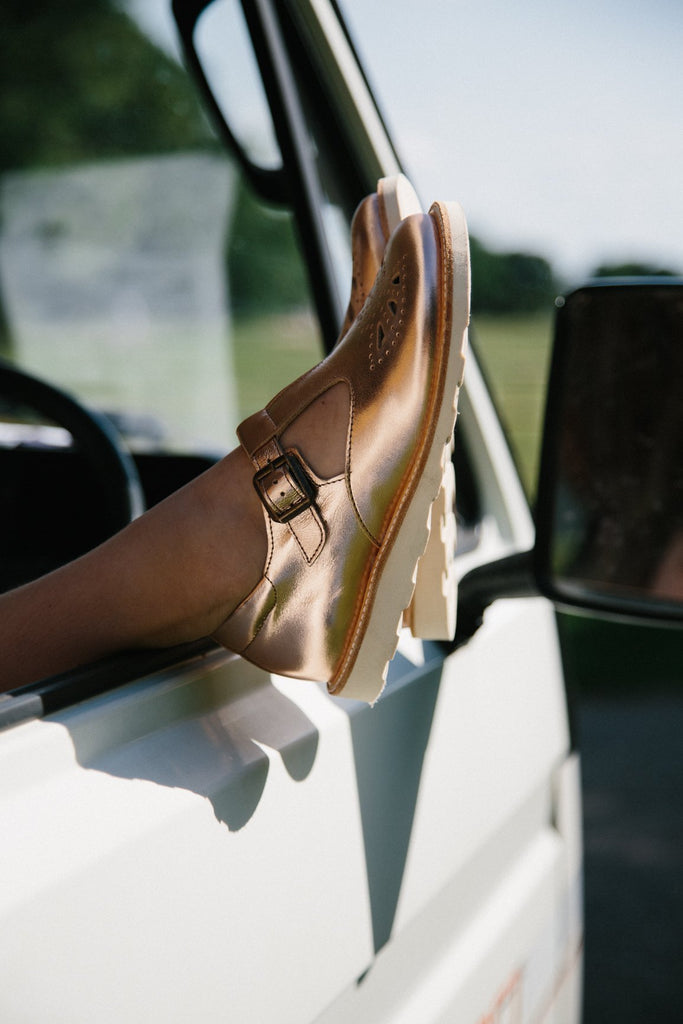 Borrowing from childhood memories, this Young Soles classic single buckle t-bar is finished beautifully with classic butterfly punch detailing.