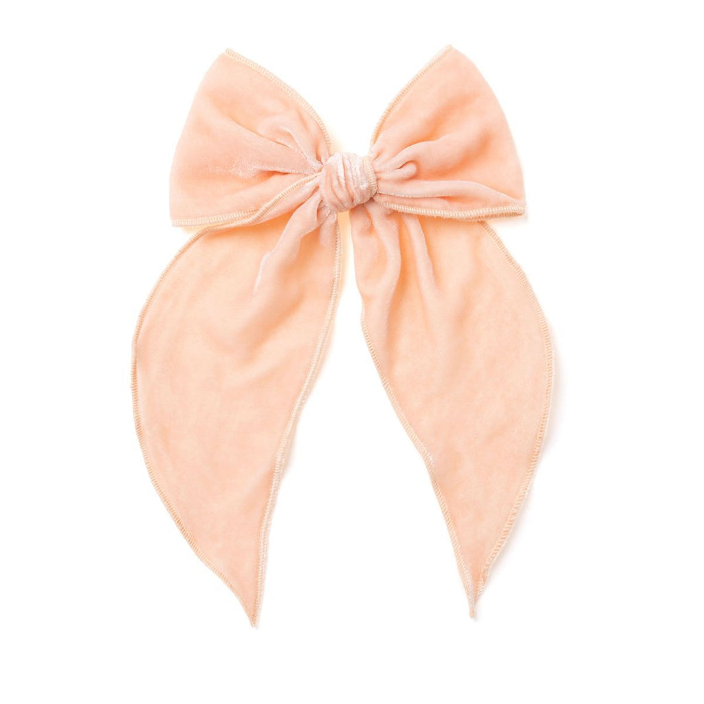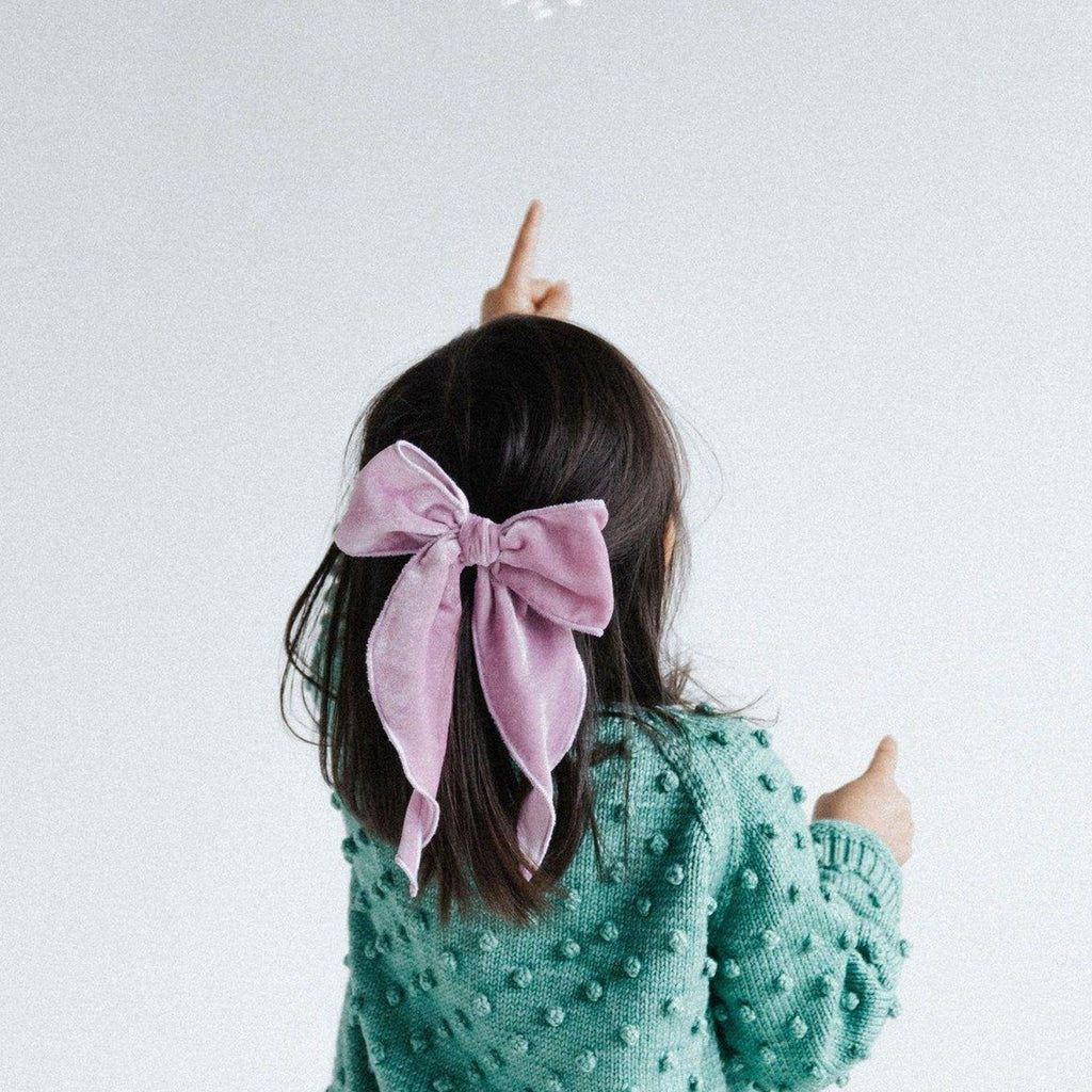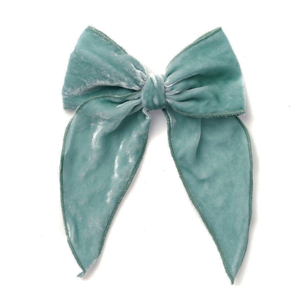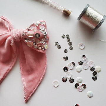 Truly one-of-a-kind! You choose your velvet base color, and your bow will be embellished with a mix of iridescent and silver sequins.